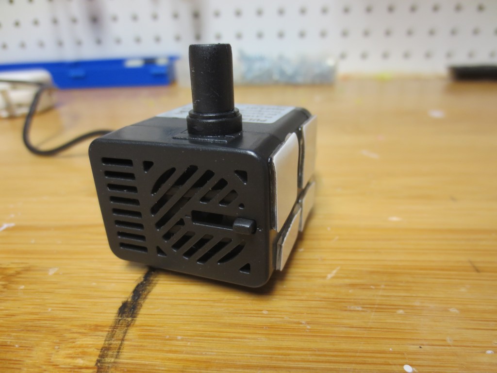 So with the addition of one tiny 3d printed part, a fountain pump, & a 12″x7.5″x2″ aluminum pan I built a water cooling system!