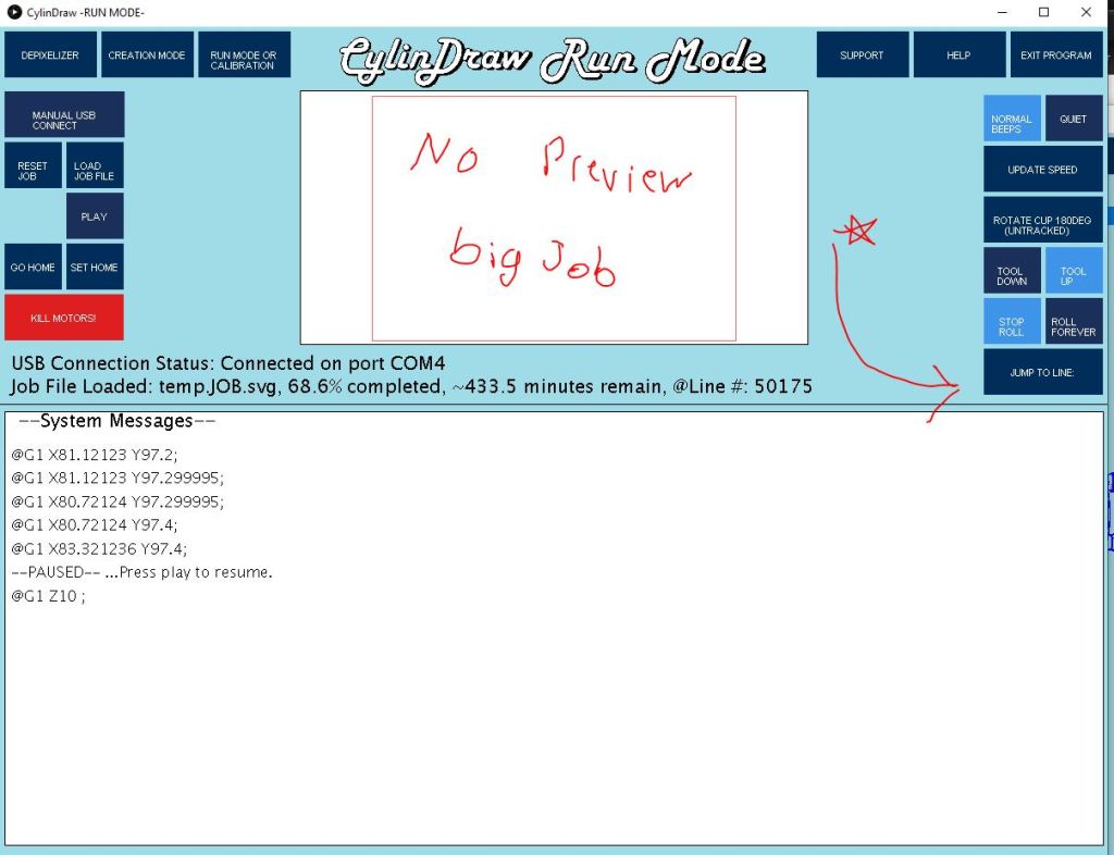Run Mode: Auto-detect & remove preview from large job files to improve loading time when opening the program. (Clicking on the image in the center of the screen still opens CylinDraw JobViewer so you can still see the entire job if you want.) Added the ‘Jump to Line’ button so you can go to any point in the job you want.