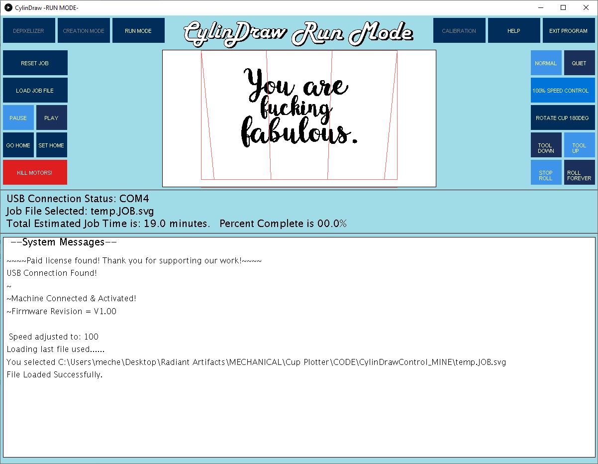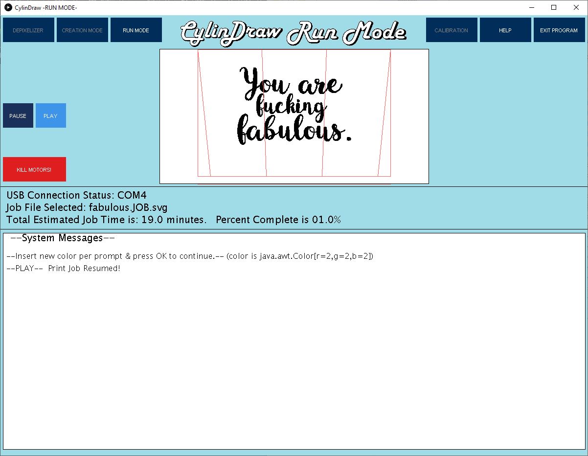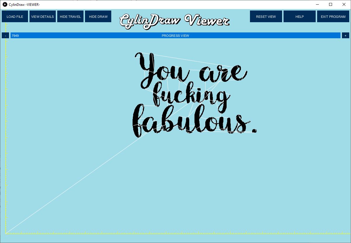 - *CylinDraw Viewer* automatically opens to preview every stroke of the job. I look at it, decide its ok then exit the Viewer.