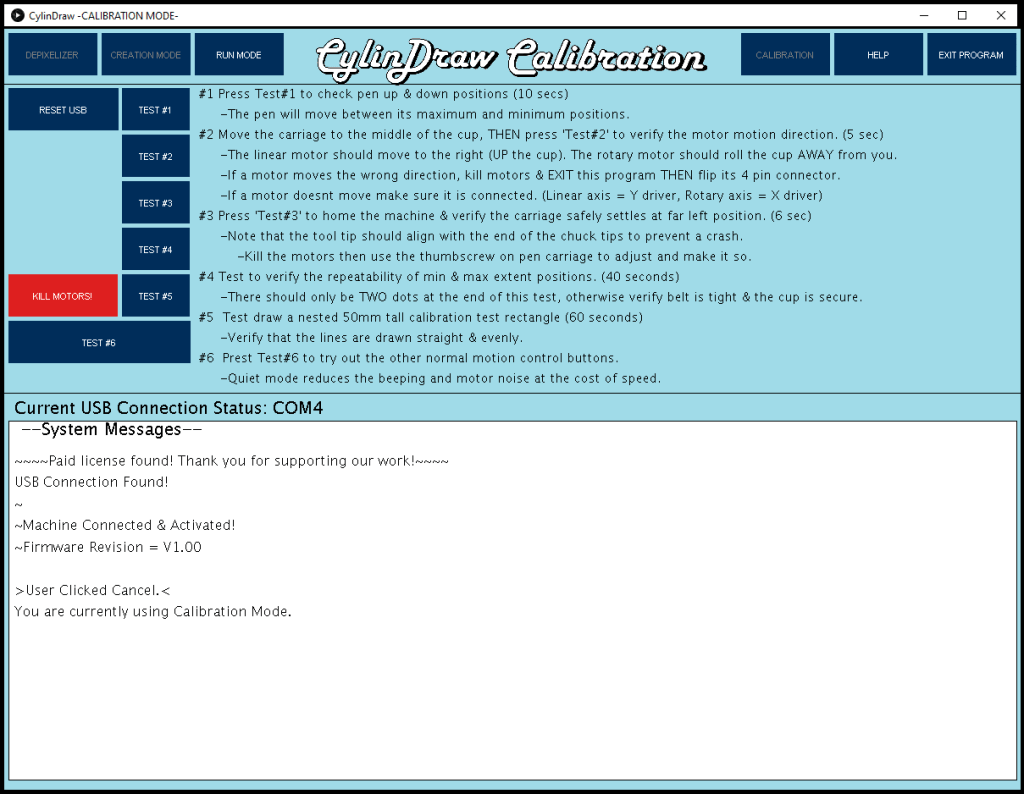 Not shown above but there is also a Calibration Mode. This is used on freshly assembled machines to gradually & safely verify functionality of all features & help troubleshoot if something doesn’t work! It exists to help you test out a freshly assembled machine by running through a sequence of tests & verifications, to safely check everything before attempting to run a full job.